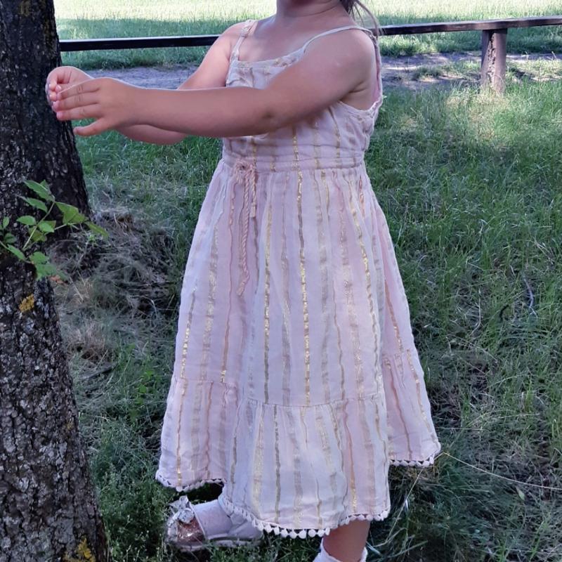 сарафан на девочку, по бирке 4- 5 лет. На фото девочке 3 года длина с бретельками-57 грудь- 25 талия- резинка- 24 бедра- свободно -подклад и основная ткань- хлопок. -цвет персиковый с золотыми полосками