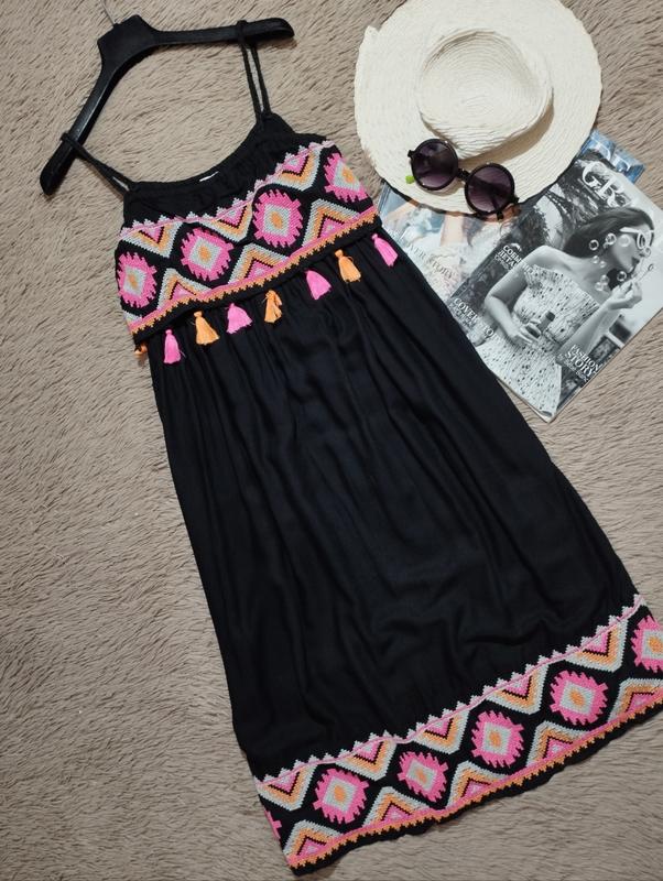 В идеальном состоянии. Красивое платье с вышивкой в этно стиле. Тканина легка, не тягнеться. Размер на 9 лет (134см), но смотрите по замерам Замеры (полуобхват): Груди 41 Талия 34 Стегна 62 Длина с шлейками 100