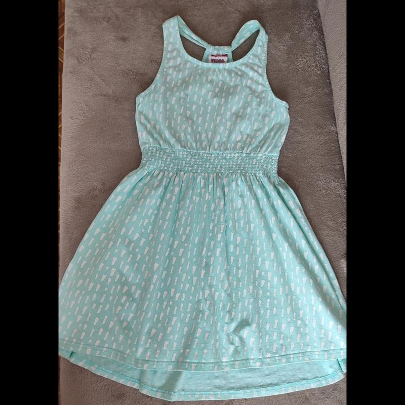 Сарафан на девочку 9-10 лет, рост 134-140 см. Фирма YIGGA. Натуральная ткань, яркий цвет. Длина впереди 73 см, сзади сарафан длиннее 77 см, ПОТ 26 см, но тянется. От верха бретель до талии 32 см