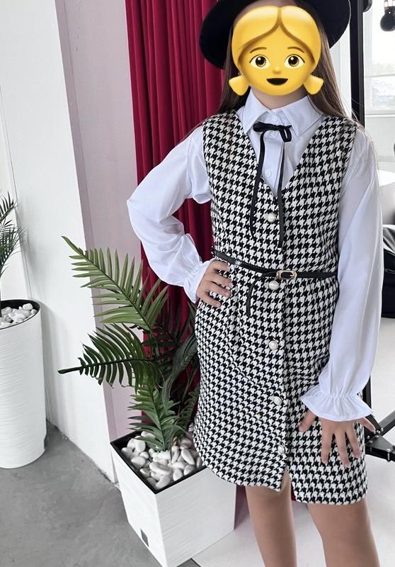 Святковий комплект для дівчинка: сарафан + блузка - ідеально для свята знань чи фотосесії 👌🏼 Поясок іде в комплекті, блуза на ґудзиках, на манжетах рукавів резиночка, сам сарафан з товстішої тканини, є кармани. Заміри є на фото, за додатковою інформацією - пишіть)