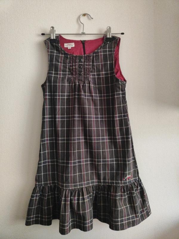 Одежда этого бренда очень качественная. Сарафан удобен, классная стильная модель, на молнии сзади. Тканина трошки тягнеться. Идеально для школы. Замеры: полуобхват груди 34,5 см, ширина снизу до рюшей 42,5 см, длина по спинке 67 см.
