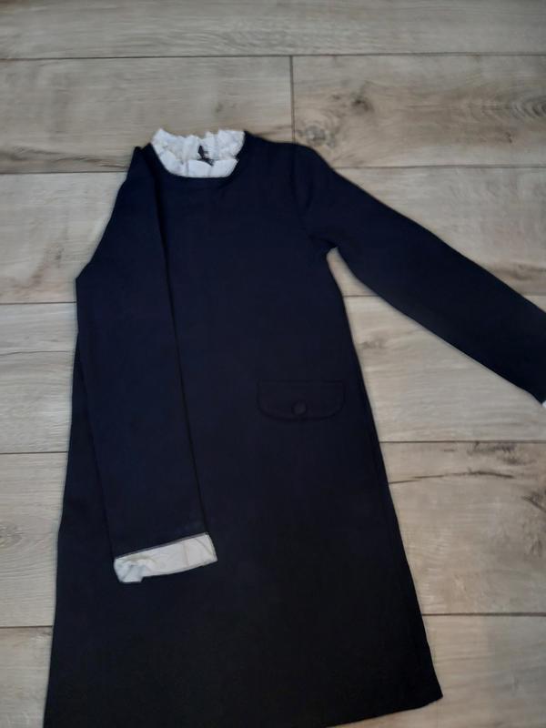 Элегантное детское платье темно-синего цвета с длинным рукавом. Имеет нежный белый воротничок-оборка и накладные кармашки с пуговицами. Стильный и удобный вариант для школы, праздников или торжественных событий.