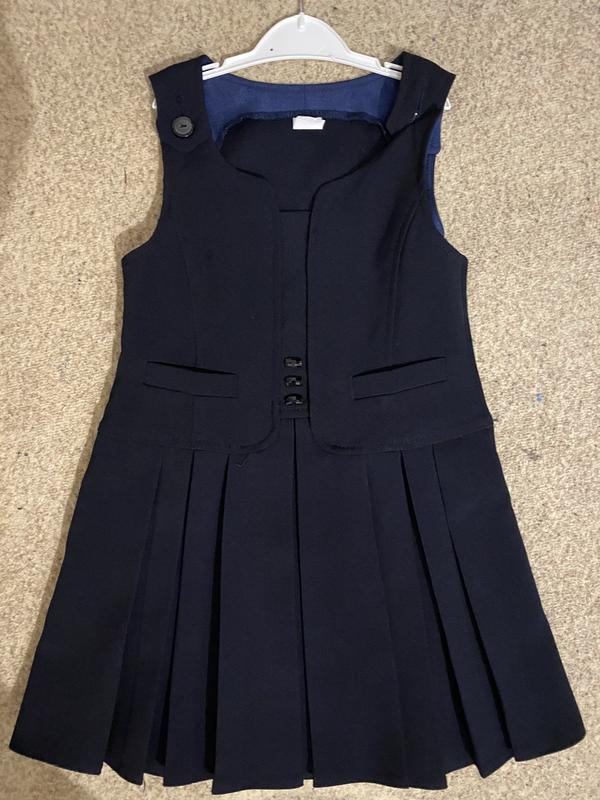 Колір: Темно-синій (насичений, класичний). • Стиль: Приталений верх, що імітує жилет з невеликим вирізом, і плісирована спідниця середньої довжини. • Деталі: • Спереду розташовані декоративні кишені-клапани та ряд із трьох невеликих ґудзиків на лінії талії. • На лівому плечі є більший ґудзик для застібки/регулювання або як декоративний елемент. • Сарафан має широкі бретелі, що створюють ефект жилета. 🏷️ Інформація з ярлика: • Розмір: 122 (зазвичай відповідає зросту дитини). • Склад тканини: • WC: 60% (Це скорочення може означати вовну (Wool/Wolle) або віскозу/віскозну пряжу (Viscose), але точне значення поза контекстом бренду неможливо встановити лише за абревіатурою). • POLIESTER (Поліестер): 35% • LYCRA (Лайкра): 5% • Загальний склад: 60% + 35% + 5% = 100%.