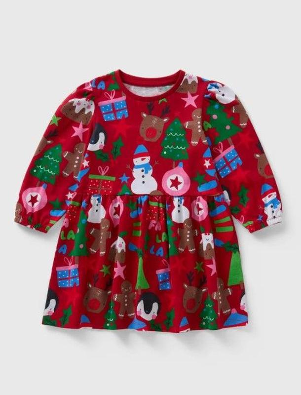 Трикотажне плаття для дівчинки. Прикрашене принтом. Круглий виріз горловини. Довгий рукав на гумці. Склад: 100% бавовна. Розмір Довжина по спинці , см Ширина під руками, см Довжина рукава від плеча, см 1,5-2 роки 47 29,5 30,5 4-5 років 57 30,5 35,5 5-6 років 61 32 38 6-7 років 63,5 33 39