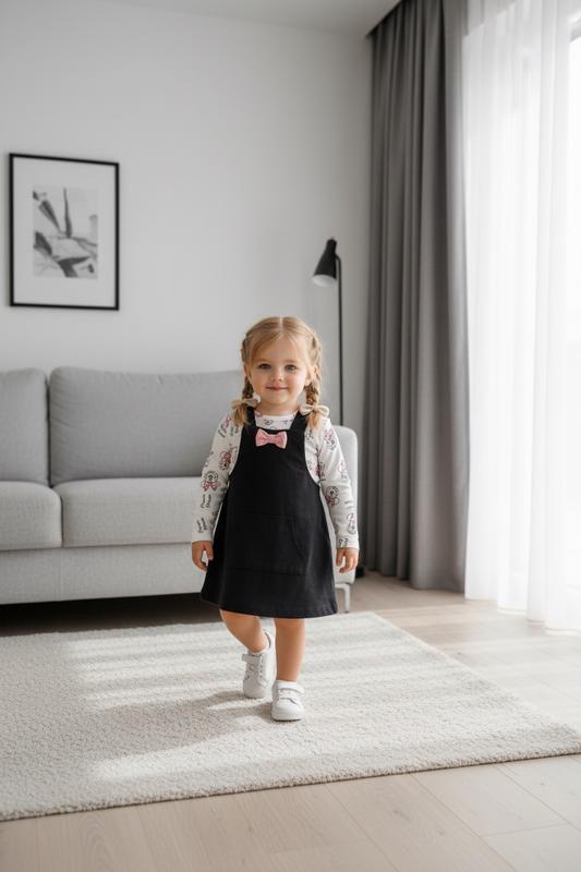 Стильний набір для дівчинки 2 в 1 У комплекті: • лонгслів з принтом Minnie Mouse • чорний сарафан з кишенею та декоративним бантиком Зручний та практичний комплект, речі можна носити разом або окремо. Матеріал приємний до тіла, комфортний для щоденного носіння. Чудовий варіант для садочка, прогулянок або святкових подій Стан новий, 92р