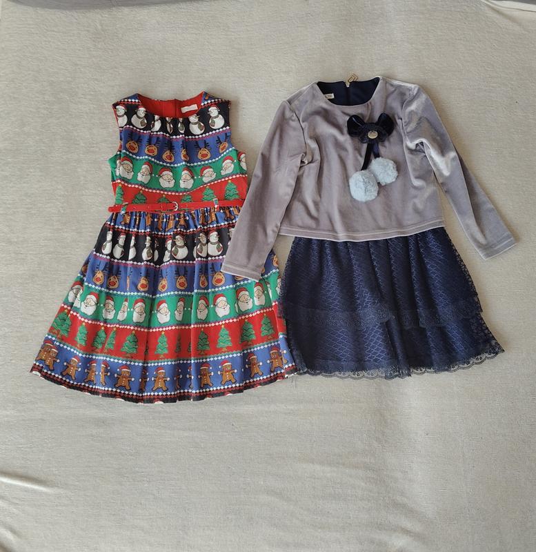 Продаю одним лотом. Дочь одевала в 4-5г. на мероприятии. Новогоднее - х/б ткань, красный пояс. Серое - сверху велюровое, цельное.