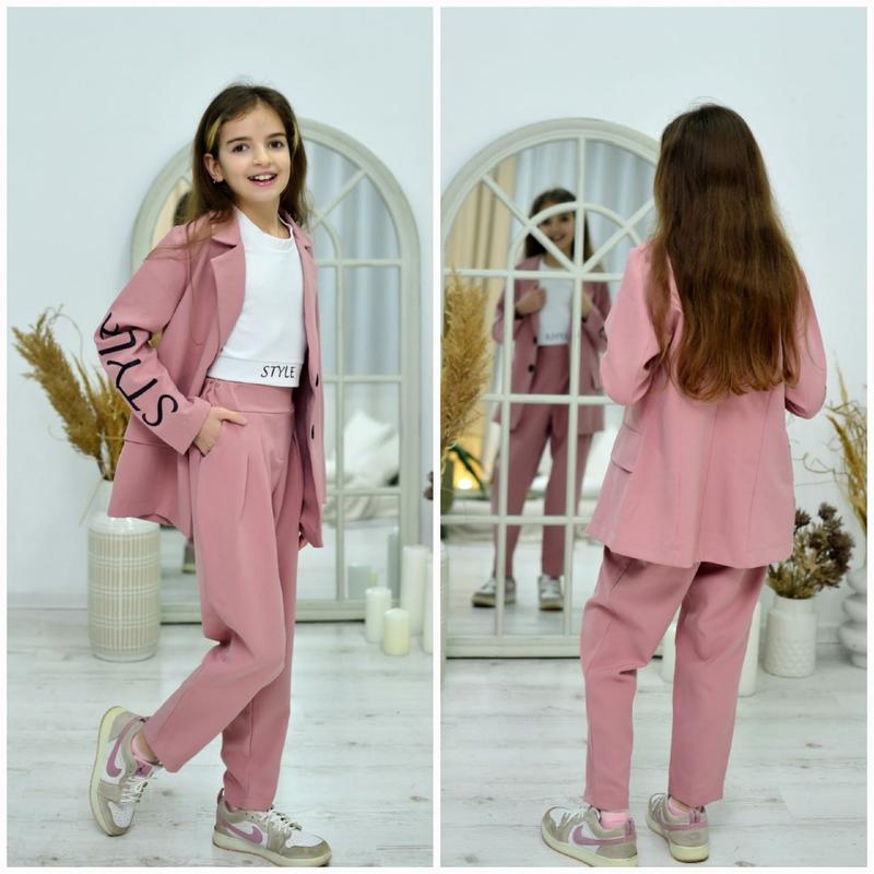 ❤️НОВИНОЧКА ❤️ 🤍Костюм тройка, который может быть праздничным и повседневным. Жакет и брюки из качественной костюмной ткани. 🤍Жакет без подкладки, застегивается на две пуговицы. Топ пошит из мустанга в рубчик. Перчатка в топе футбольная. 🤍На рукавчик пиджака и топ, наклеенные качественные наклейки. 140 146 152 158 164 💸Цена 755 грн