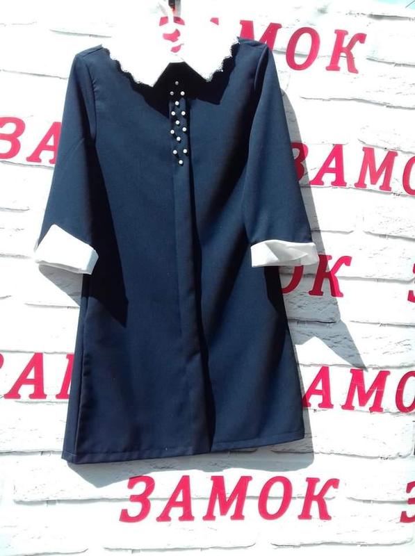 Колір: темно-синій. Тканина: креп костюмний Туреччина. Фурнітура: бусинки. Стильна шкільна сукня з білим комірцем виготовлена з костюмної тканини. Завдяки розкльошеному фасону добре сидить на худеньких дівчатках, і на дівчатах з формами. Сукня з кишенями. Комірці знімаються, і на рукавах також.