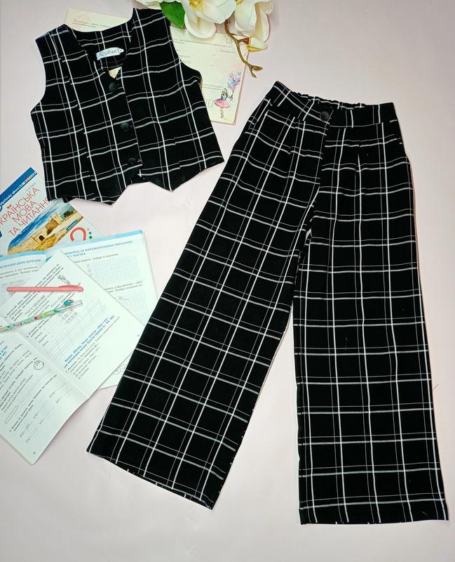 нов мод 🍂🍂🍂Новинка осень🍂🍂🍂 Школьная коллекция Крутой костюм двойка жилет+палаццо тканина костюмка штаны палаццо, сзади на резинке В живую выглядит супер 😍 размер/длина жилета/пог/длина брюк/шаговой шов/пот 📌134(1шт)-36/36/83/59/27 📌140(1шт)-39/38/88/64/29 📌152(1шт)-42/43/95/68/31 📌158(1шт)-42/43/99/73/32