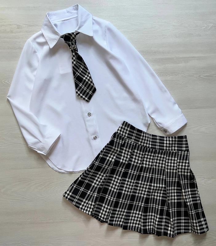 Вишуканий комплект для дівчинки - тканина блузи: софт - спідничка: тіар плісе - в спідничці на спинці є резиночка,застібка на блискавку сбоку - галстук на резиночці зйомний Заміри: рукав від плеча/довжина/ пог спідничка довжина/бедра/ пояс Допустима похибка (+-2см) 122 - 43/51/38/33/33/27 128 - 45/53/39/35/34/28