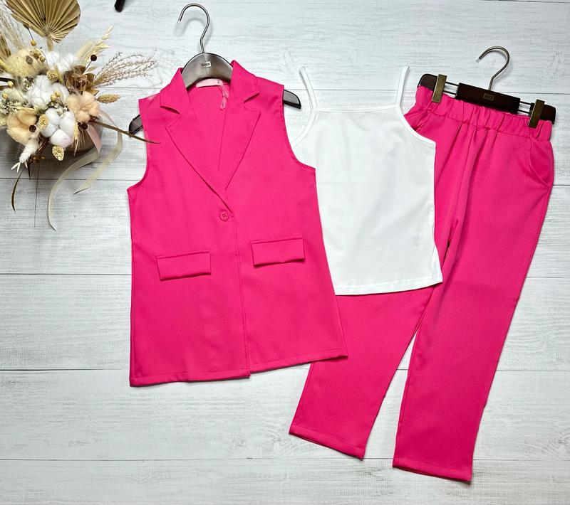 💝Стильный костюм тройка для модницы 🏷Размеры: 122-164 🪡Жилет и брюки из костюмной ткани. Брюки в поясе на резинке, красиво тянется. Майка хлопок, красиво тянется. Производитель Турция 📐Замеры: Длина жилета/ширина по спинке/длина майки со шлейками/ширина/длина брюк/шарик/резинка/поб 8-55/38/44/32/71/46/26/38 10-59/38/47/32/77/52/27/41 12-61/41/50/35/85/59/30/42 14-64/43/52/36/90/62/3044 16-69/45/56/39/93/67/31/45 арт кид