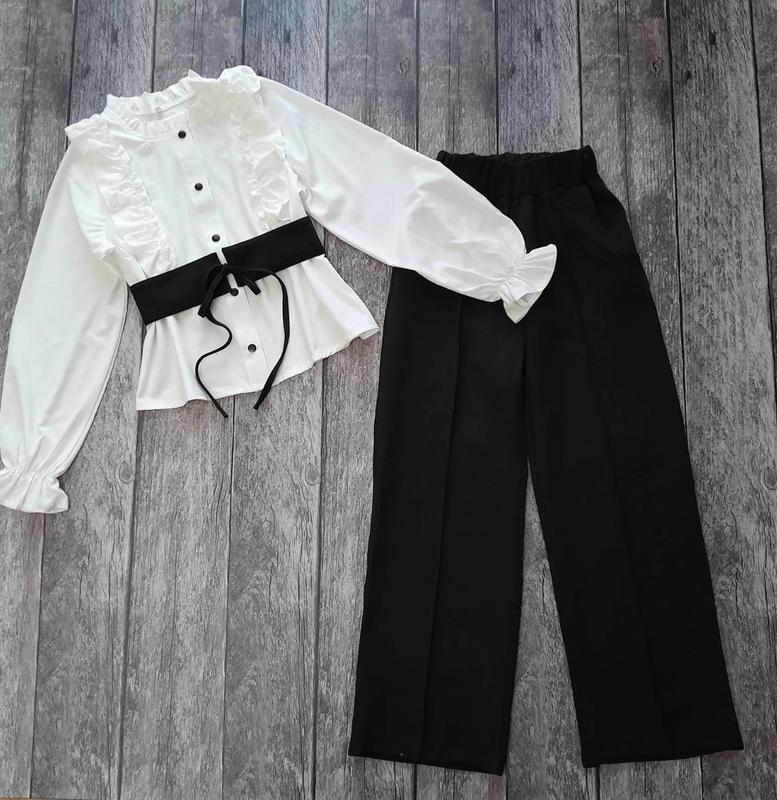 Стильный и модный костюм Сорочка + штани Палацо Сочка застегивается на кнопки. Пояс в комплекті. В брюках есть карманы. Тканина сорочка - софт, Палаццо костюмка. Замеры: 134 рубашка длина - 42см, полуобхват груди - 37см, рукав от плеча - 50см. брюки длина - 79см, шаг - 59см, пояс - 24см, полуобхват бедер - 42см. 140 рубашка длина - 44см, полуобхват груди - 38см, рукав от плеча - 52см. брюки длина - 84см, шаг - 63см, пояс - 25см, полуобхват бедер - 44см. 146 рубашка длина - 46см, полуобхват груди - 40см, рукав от плеча - 56см. брюки длина - 87см, шаг - 66см, пояс - 26см, полуобхват бедер - 45см. 152 рубашка длина - 49см, полуобхват груди - 42см, рукав от плеча - 59см. брюки длина - 90см, шаг - 68см, пояс - 28см, полуобхват бедер - 46см. 158 рубашка длина - 51см, полуобхват груди - 44см, рукав от плеча - 62см. брюки длина - 93см, шаг - 70см, пояс - 29см, полуобхват бедер - 48см. 164 рубашка длина - 53см, полуобхват груди - 45см, рукав от плеча - 63см. брюки длина - 96см, шаг - 73см, пояс - 30см, полуобхват бедер - 52см.