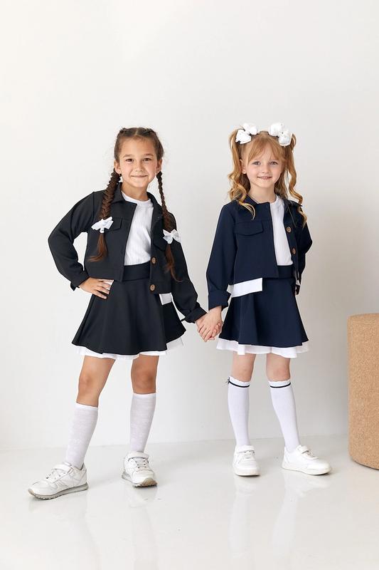В наличии! Стильный костюмчик, модель на пике популярности. Может быть и как костюмчик в школу. Жакетик и юбочка - шорты Тканина - костюмка. Цвет - черный, темно-синий Замеры: (длина вместе с белой отделкой.) 116 жакет длина - 34см, полуобхват груди - 31см, рукав от плеча - 39см. юбка длина - 30см, пояс - 23см. 122 жакет длина - 35см, полуобхват груди - 33см, рукав от плеча - 40см. юбка длина - 31см, пояс - 24см. 128 жакет длина - 38см, полуобхват груди - 35см, рукав от плеча - 42см. юбка длина - 32см, пояс - 25см. 134 жакет длина - 39см, полуобхват груди - 37см, рукав от плеча - 44см. юбка длина - 35см, пояс - 26см. 140 жакет длина - 42см, полуобхват груди - 39см, рукав от плеча - 45см. юбка длина - 37см, пояс - 27см.