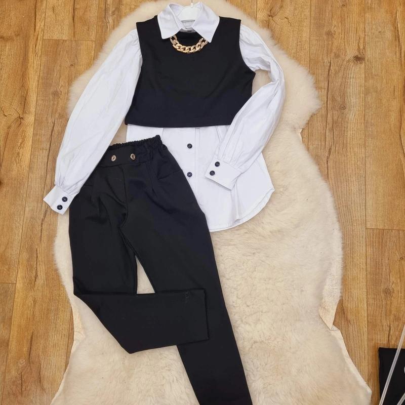 В наличии! Стильный костюм тройка Штани + топ + рубашка Тканина - рубашка - котон, штани і топ - костюмка На топе есть цепочка. Замеры: 134 - рубашка-длина 52см, рукав - 47см, полуобхват груди -37см. топ- длина - 31см, полуобхват груди - 37см. брюки- длина - 73см, шаг - 53см. 140 - рубашка-длина 54см, рукав - 48см, полуобхват груди -38см. топ- длина - 33см, полуобхват груди - 38см. брюки- длина - 79см, шаг - 59см. 146 - рубашка-длина 57см, рукав - 50см, полуобхват груди -40см. топ- длина - 35см, полуобхват груди - 39см. штани- довжина - 83см, крок - 63см. 152 - рубашка-длина 60см, рукав - 52см, полуобхват груди -42см. топ- длина - 37см, полуобхват груди - 41см. брюки- длина - 87см, шаг - 69см. 158 - рубашка-длина 64см, рукав - 55см, полуобхват груди -45см. топ- длина - 38см, полуобхват груди - 43см. штани- довжина - 92см, крок - 71см. 164 - рубашка-длина 68см, рукав - 57см, полуобхват груди -47см. топ- длина - 39см, полуобхват груди - 44см. брюки- длина - 97см, шаг - 74см.