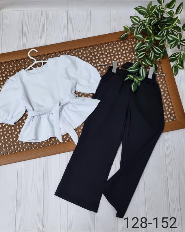 ️В НАЯВНОСТІ Костюм для девочки Блуза и штаны палаццо Костюмна тканина Блуза свободного кроя с пояском, по спинке скрытая молния. Штаны палаццо на резинке и с карманами Цвет блузы белый, штаны черные 128 134 140 146 152 📍128-длина блузы 40, пог 35,рукав 26,длина брюк 74, крок 53 📍134-длина блузы 43, пог 36,рукав 28, длина брюк 78, крок 55 📍140-длина блузы 46, пог 38,рукав 30,длина брюк 81,шаг 57 📍146-длина блузы 47,пог 40,рукав 31, длина брюк 86, крок 61 📍152-длина блузы 49, пог 42,рукав 32,длина брюк 90,шаг 63 +-2 см