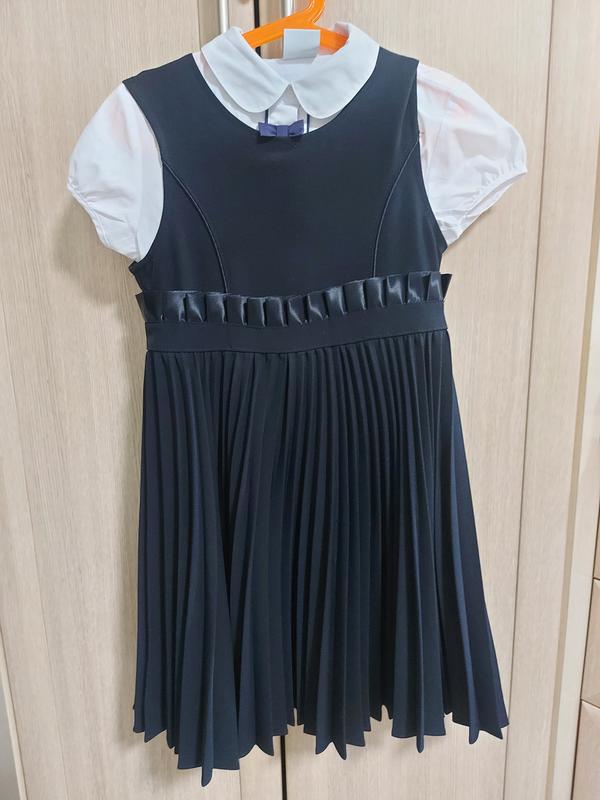 Костюм школьный для девочки: сарафан темно синего цвета+ блузка Состояние идеальное, почти новое. Состав Сарафан 100%полиэстр Блузка 65% хлопок, 35% полиэстр Подойдут на рост 140см