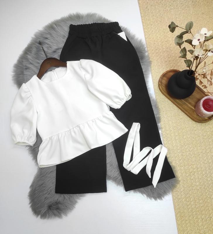 В наличии 🧡 Костюм для девочки Блуза и штаны палаццо Костюмна тканина Блуза свободного кроя с пояском, по спинке скрытая молния. Штаны палаццо на резинке и с карманами Цвет блузы молочный, штаны черные замеры: длина блузы/пог/рукав/длина брюк/кр********/74/53 134-43/36/28/78/55