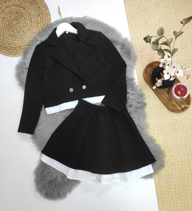 В наличии 🧡 Стильный костюм для модницы Шорты-юбка +жакет Тканина костюмка Застегивается на пуговицы, в поясе сзади резинка невероятно красивый замеры: длина/рукав от плеча/пог/юбка-шорты длин/пояс 134-41/45/38/36/27 140-42/49/39/39/28