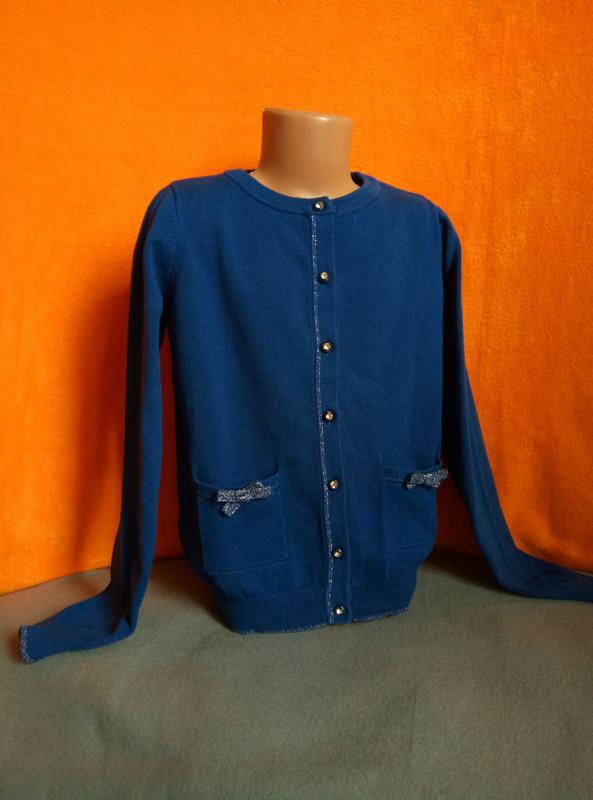 --Кофта бренда Acoolakids в отличном состоянии. Без дефектов. --Идеально в школу. С натуральным составом, не будет парить ребенка. Праздничные элементы в виде бантиков и окантовки с люрексом, еще и пуговицы со стразами. --Ткань: довольно плотный трикотаж. Склад: 80 % котон, 20 % нейлон. --Размер указан 146, на 10-11 лет --Вымеры: полуобъем груди-40, полуобъем низа-30, тянется до 37, длина от плеча до низа-49, плечо-7,5, рукав-52, ширина плеч-32 см. Перешлю Укр и Новой по почте.