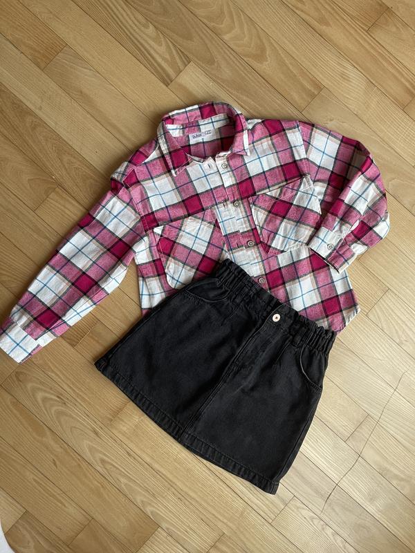 Продам отличный комплект на рост 116я Юбка джинсовая Cool Club длина 33 пояс утяжка и резинка. Рубашка вообще супер на легкой брючке длина 47 пог 38 рукав 38. Невероятный комплект в идеале.