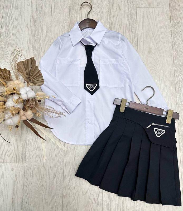 Стильний костюм для красунь Сорочка + спідниця + галстук Тканина сорочки котон, застібається на ґудзики спідниця - костюмка барбі відмінної якості, по спинці є резинка, застібається збоку на блискавку Розміри 122, 128, 134