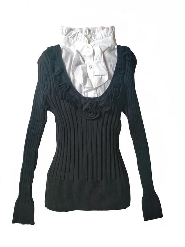 Рост 160 см - длина рукава 59 см, длина по спинке 52 см, ширина по спинке 37 см Детская нарядная черная трикотажная школьная кофта-обманка для девочки с белой горловиной. Модель "лапша" облегающая, хорошо садится по фигуре. Отличный вариант для школы .Очень мягкая и приятная на ощупь. Трикотаж хорошего качества Горловина белого цвета с рюшами, застегивается на пуговицы-жемчужинками. Состав: 90% хлопок 10 лайкра