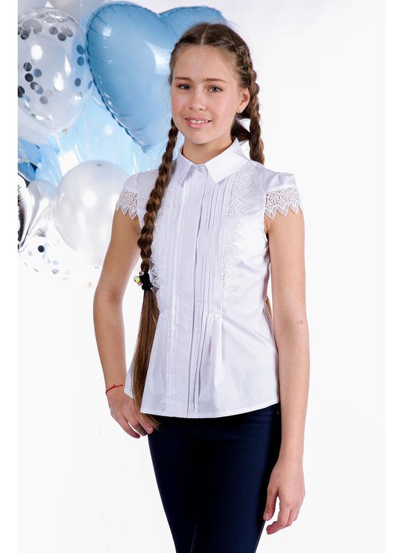Блузка для девочки, школьная Элегантная школьная блуза приталенного силуэта. Блуза с коротким рукавом, на груди украшена защипами. Полочка и рукава декорированы кружевом. Пуговицы закрыты планкой. Прекрасно подойдет для школы или торжества. Материал: хлопок, вискоза Цвет белый Размер 122, 128, 146, 152