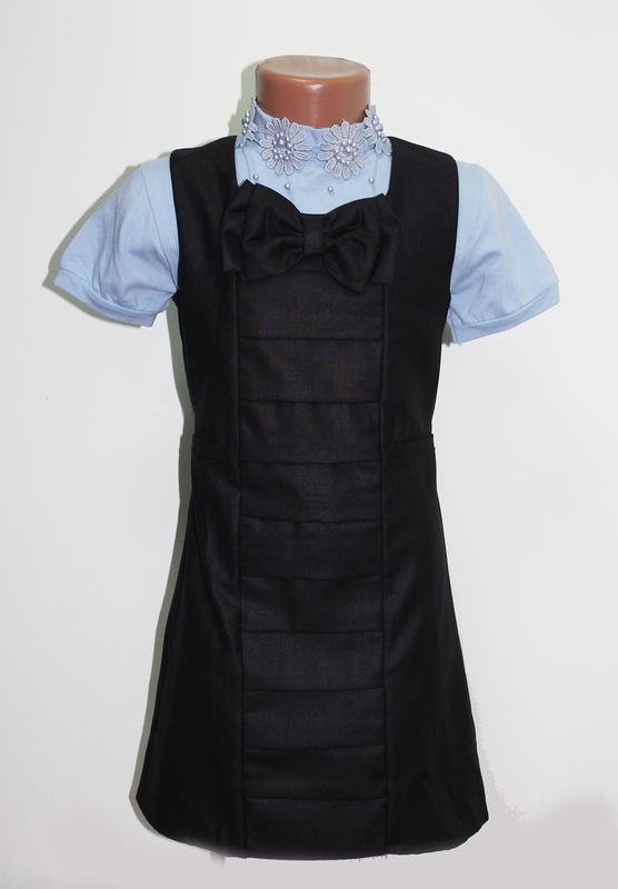 Качественный школьный сарафан для девочки из натуральной хлопковой ткани. Слегка приталенный фасон, Талия регулируется сзади пояском из ткани. Застежка - потайная молния сзади. Впереди украшен бантом Материал: 100% коттон Цвет черный Размер 122, 128