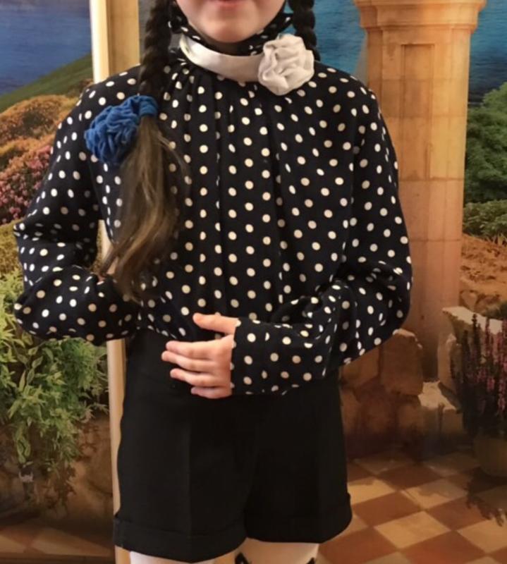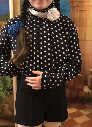 Цена указана за комплект Блузка выполнена из хлопковой струятся ткани, приятная к телу мягкая практически не мнётся На блузке есть нюанс смотрите на фото не большие полоски ( на ребёнке их не видно присоске Замеры блузки общая длина 45 см длина рукава от плеча 48 см ширина от проймы до проймы по спине 41 см Шорты общая длина 24 см пот 26 см ( есть утяжка ) поб31 см