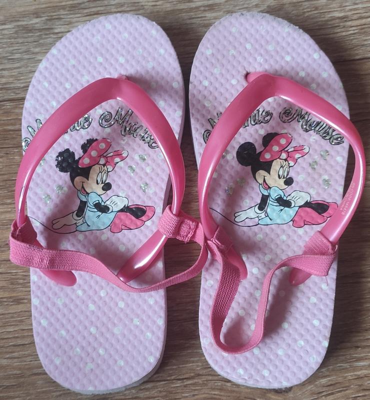 Милі шльопанці з резинкою на п'ятці. Малюнок не стертий, на носках трохи подерті і на лівому, є маленька пляма. Все є на фото Розмір 26-27 По стільці 17 см.