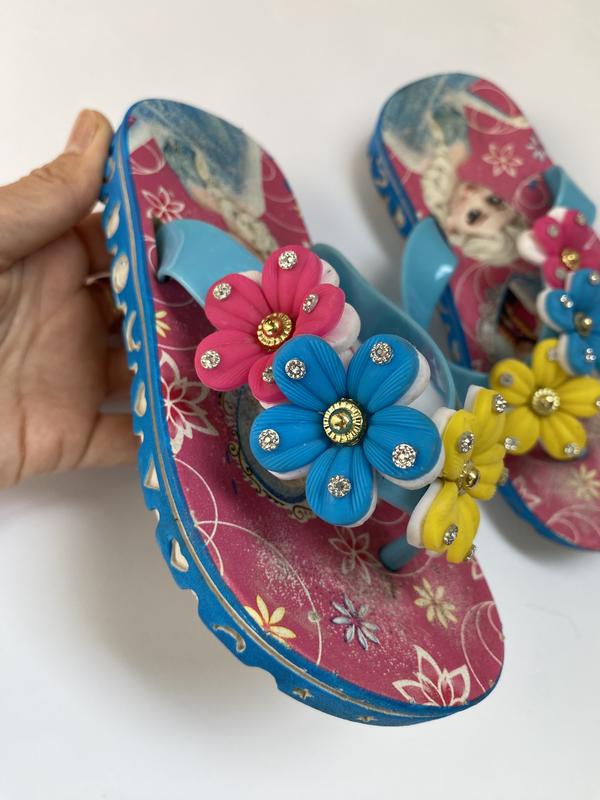 Очень красивые шлепанцы с цветами и Эльзой.Размер 30.Стан идеален.