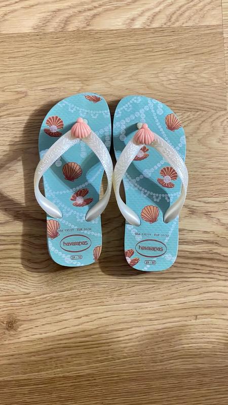 Детские фантазийные шлепанцы HAVAIANAS имеют модные причудливые принты, в том числе подводную фантазию русалки. В смелых и ярких цветах, с контрастным ремешком, дополняющим шарм. Ракушка открывается на втором фото показала)