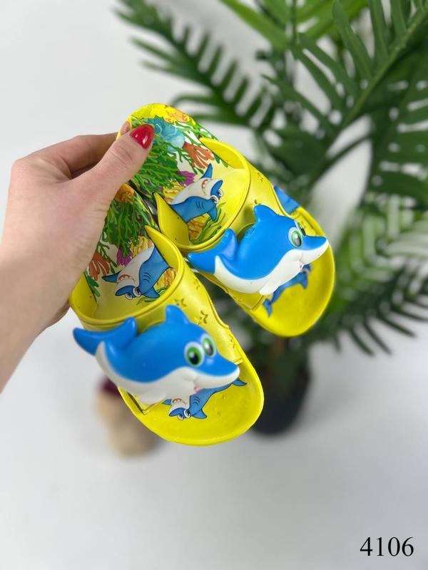 НОВИНКА Код: 4106 Детские шлепки с рисунком! Акула при нажимании пищит. Размер: 25-32. Производство: Польша. Подошва: 1 см. Маломер. Пено-Гума. Цвет: Желтый. 25-15 см 29-17,5 см 30-18,5 см 31-19 см 32-19,5 см