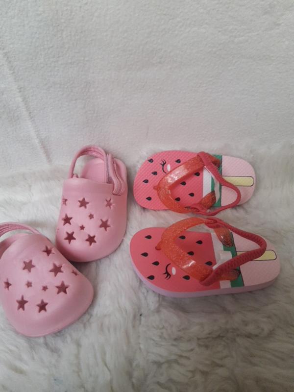 Шлепанцы и сланцы,новые. Шлепанцы: Верх и подошва EVA, легесненькие,лямка на липучке, которая регулирует пятку, 11.2 см.стелька. Сланцы: Верх силиконовый, сзади лямка с резинкой,подошва плотная микропорка,силиконовая лямка не приклеена, она проходит насквозь подошвы,качественные и для воды. 13 см.стелька. Цена за одни.