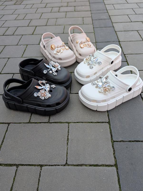 Невероятно стильные кроксы для девушек на трендовой подошве Украшения снимаются. Очень легкие и удобные. Выглядят мега стильно. Замеры сделаны до бортика. Размеры: Черные✅ ========= Белые 38р-24см ========== Беж✅ 40р-25см ✅✅Цена 650