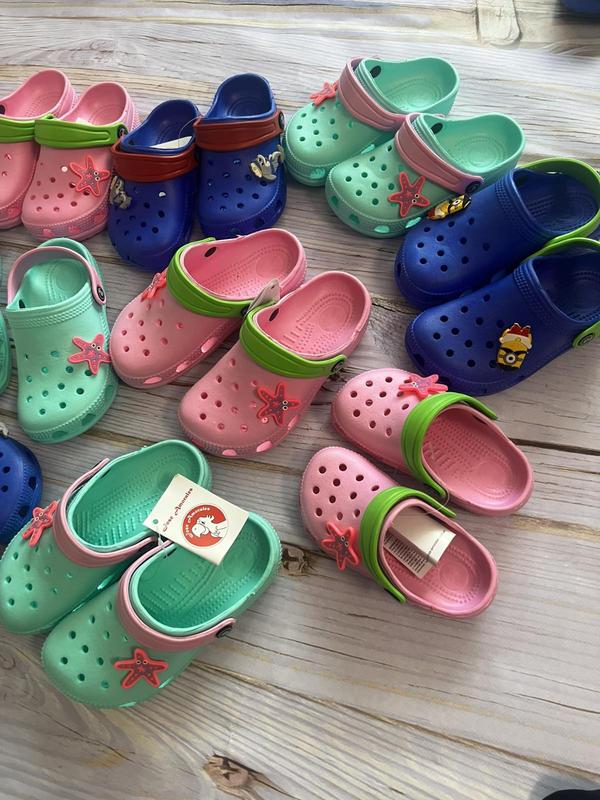 Кроксы для мальчиков и девочек разных размеров бренда Amorales. Для девочек цвет розовый и зеленый (тифани) с морской звездочкой, для мальчиков синие с дельфином и миньоном. Производство Украина Размеры для девочек розовые: 1. 14 см 2.15 см 3. 16 см 4.18 см Размеры для девочек тифани: 2.15 см 3. 16 см 4.18 см Размеры для мальчиков: 1. 14 см 2.15 см 3. 16 см 4.18 см