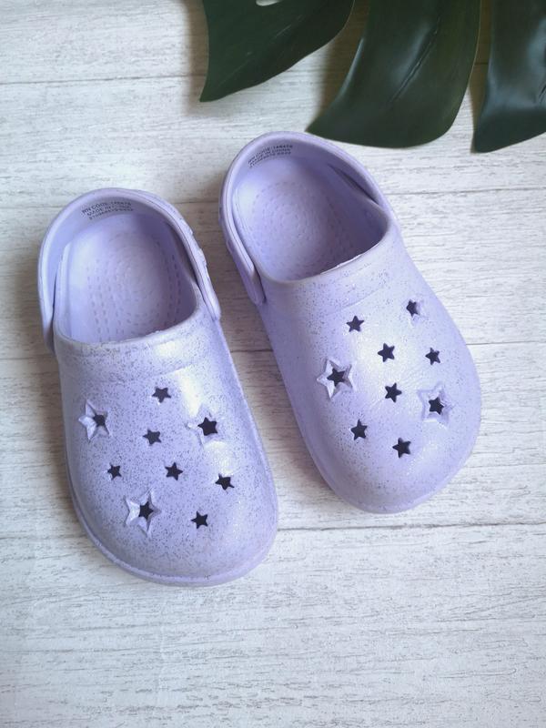 Кроксы с звездочками и блестками от Primark. Всё, как любят девочки. Маломерят от заявленного размера. Подойдут на ножку 16.5-17 см. На размер 26-27. Есть умеренные следы носки на носах - виден на фото. В другом состоянии отличное.