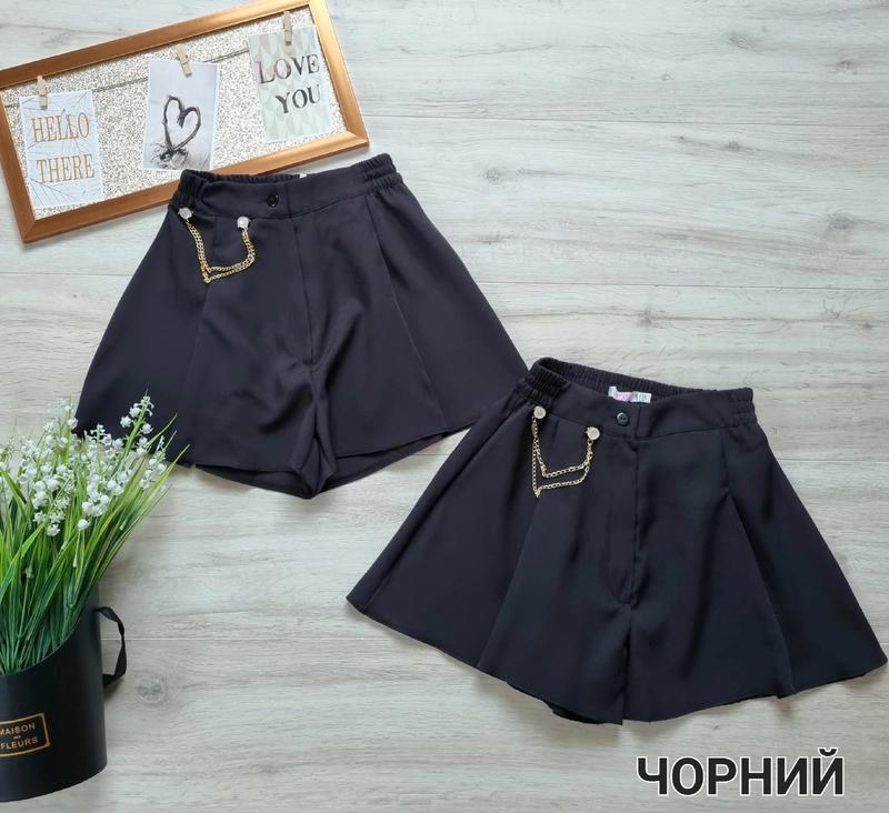 Шорти спідничка тканина костюмка пояс на резинці прикрашені ланцюжком 128 довжина 31,пояс 25 134-довжина 33,пояс 26 140 довжина 34,пояс 27 146 довжина 35,пояс 27 152 довжина 36,пояс 29