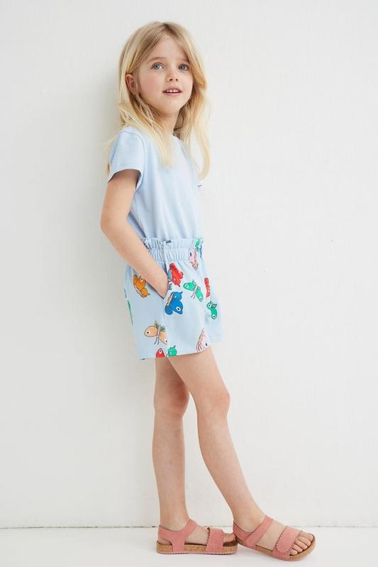 Трикотажные шорты для девочки, пояс на широкой резинке, с карманами. Цвет: Голубой. Состав: 100% хлопок. Рост 122 (6-7 лет) - Длина 27 см, посадка спереди до шва 23 см, полуобхват талии 27 см, полуобхват бедер 38 см.
