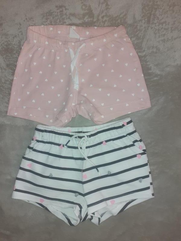 Комплект шорти від H&M Блідо-рожеві (персикові) розмір 1,5-2 роки 92 см (склад 100% бавовна), більш тоненькі. Білі в сердечки 1,5-2 роки 92 см (100% бавовна), більш плотніші Гарний стан, ціна вказана за комплект. Заміри за запитом. Ми носили в 3 та майже в 4 роки.