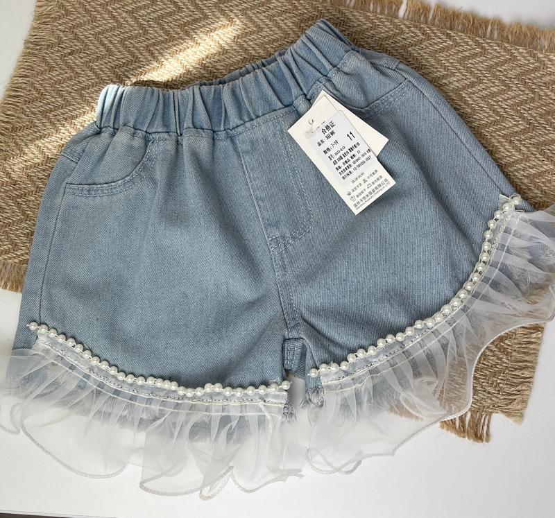Стильные джинсовые шорты украшены рюшами из шифона и жемчужинками ❤🔥 В поясе сзади есть резинка Очень стильно смотрятся🥰🥰🥰 Хорошее качество ❤ 100/9 - длин 23 см,пояс 19 см(2 шт) 110/11 - длин 24 см,пояс 20 см(2 шт) 120/13 - длин 25 см,пояс 20 см(1 шт) 130/15 - длин 26 см,пояс 20 см(3 шт) 140/17 - длин 27 см,пояс 21 см(4 шт) В поясе красиво тянутся