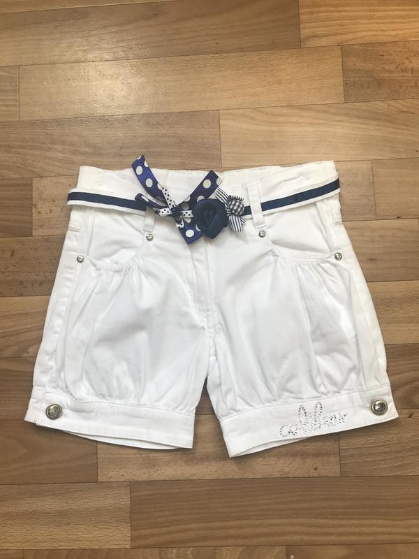 Шорты на девочку от бренда Colabear. Цвет - белый. Размер 122,130р. Спереди и сзади карманы украшены стразами. В комплекте идет пояс синего цвета. Застежка спереди на молнии и пуговицу. Склад:95%бавовна,5%еластан.