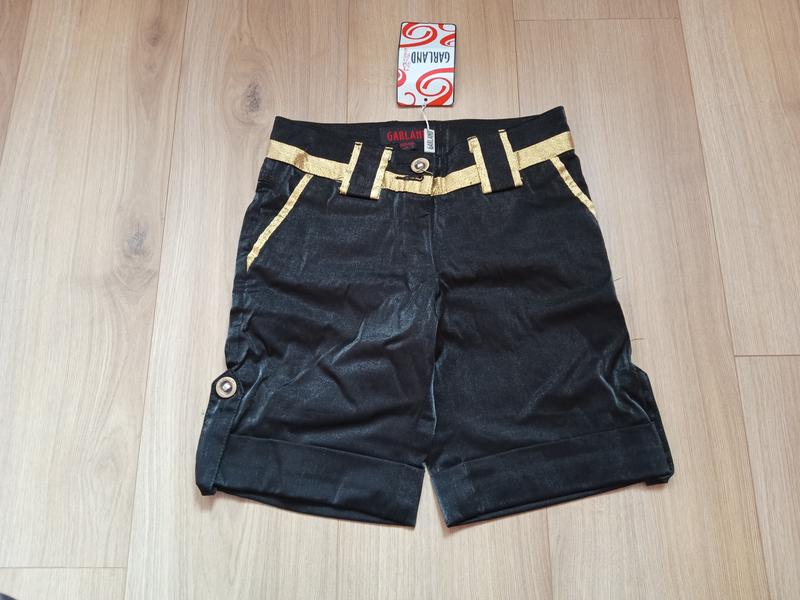 Черные шорты. Ткань чуточку тянется. Рост около 140-146. Длина 40, внутр. шов 20, пояс 31 (утяжки нет), поб 41. Новые. Подарили, но ребенок не хочет одевать.