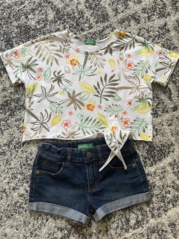 Джинсовые шорты фирмы Benetton, размер указан 3-4 года 100 см, но одевали до 5 рочков. Состояние отлично. Заміри на фото. Футболка в подарок