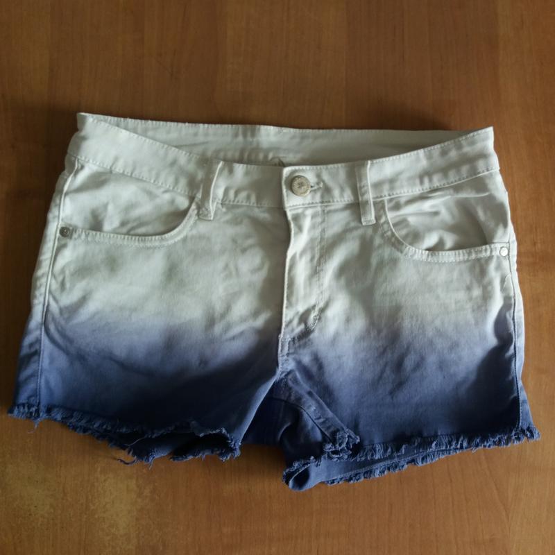 Шорты двухцветные джинсовые фирмы "H&M", р.158 ( 12-13 лет ). Материал - 98% коттон, 2% эластан. Внизу бахрома. Ширина по линии бедер 41,5 см. В хорошем состоянии.