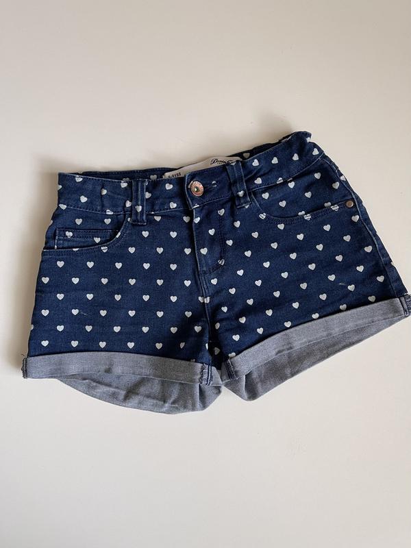 Отличные джинсовые шорты в сердечки. По бирже на 134 см, будут раньше. Есть утяжка- резинка, хорошее состояние.