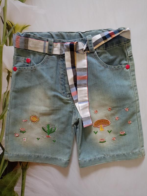 Джинсовые шорты новые. Размер - 104. Полуобхват талии - 27 см., тянутся до 29 см. Полуобхват бедер - 31 см. Крок - 13 см. Посада - 19/22 см. Длина всей вещи - 32 см. Тканина не тягнеться.