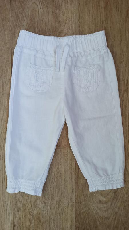 Next. Бирку срезала, примерно 3-5 лет. В очень хорошем состоянии. Ткань похожа на лен. Беленькие, мягкие, приятные на ощупь. Завязки не регулируются, пришиты. Спереди и сзади по два кармана. Внизу на резиночках. Очень красивые и нарядные. Смотрятся супер) На лето то, что нужно!