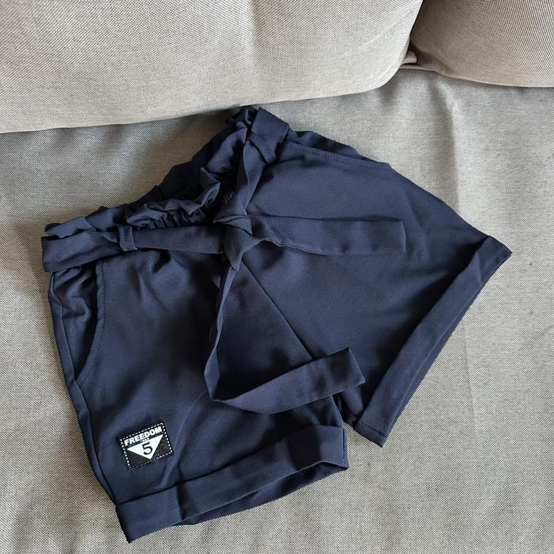 Удобные и стильные шорты темно синего цвета, отличного качества! Обязательный предмет в гардеробе настоящей модницы! Пояс присборен на резинке. Дополнительно декоративный пояс. Ткань - мадонная (качественная ткань для пошива школьной одежды). Размеры: 116- длина 27 122- 28см 128 – 29см 134 – 30см 140 – 31см Цена: 395 грн