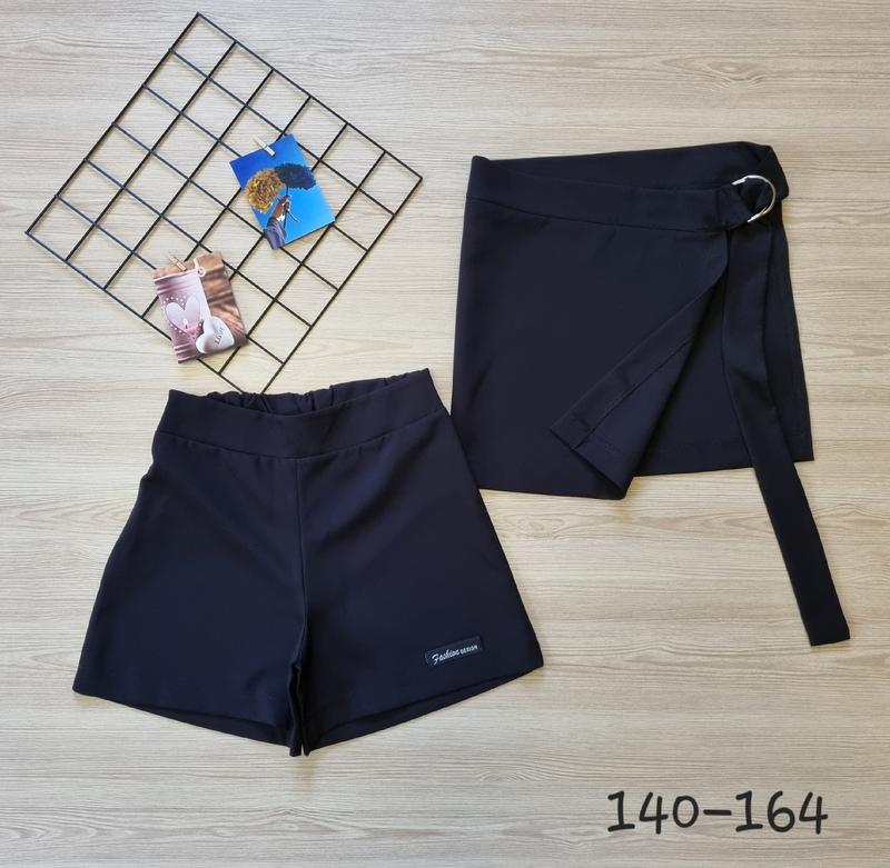 В НАЯВНОСТІ!!! Шорты - юбочка Ткань костюмка плотная, очень хорошего качества Юбка отдельно, на талии фиксируется на пуговицу и петлю Шорты сзади на резинке, можна носить сами цвет черный 140(3 шт)-длина 33,пояс 26, поб 36 146(3 шт)-длина 34,пояс 27, поб 39 152(4 шт)-длина 35,пояс 29, поб 40 158(1 шт)-длина 36,пояс 30, поб 43 164(3 шт)-длина 37,пояс 32, поб 45 +-2 см